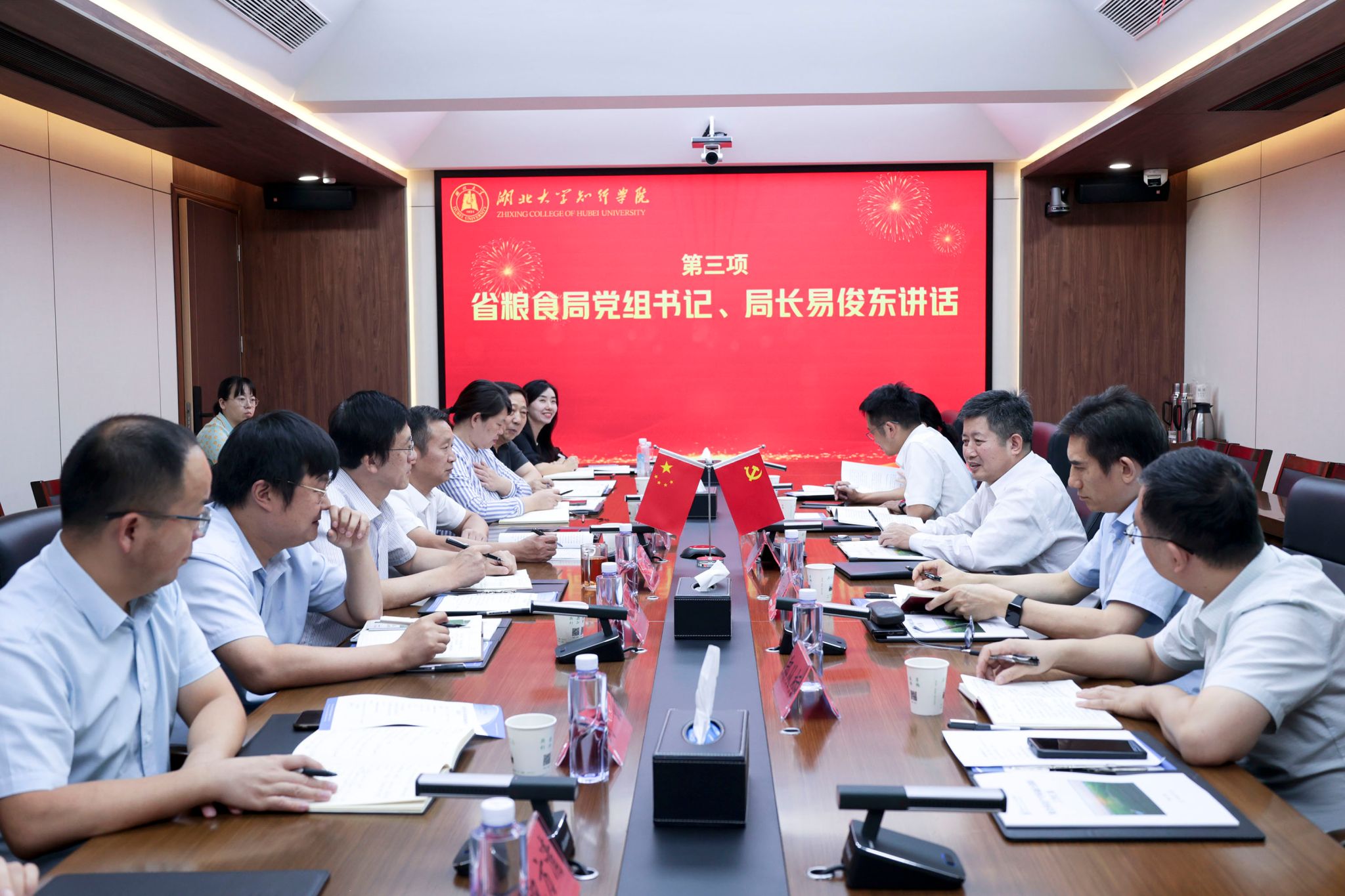 高连顺首先代表学校对易俊东局长一行的到来表示热烈欢迎,向省粮食局长期以来对学校事业发展的关心支持表示衷心感谢。他表示,湖北大学知行学院前身为湖北省粮食学校,双方历史渊源深厚,合作基础好,在涉粮专业人才培养、科技成果转化、职业技能鉴定、粮食安全科普宣传等方面合作成效显著,学校将赓续与粮食行业的血脉联系,聚焦粮食行业需求,坚定不移服务粮食安全与粮食产业发展,进一步凝练涉粮专业特色和优势,加强涉粮专业建设,为推进科技兴粮、人才兴粮作出新贡献。院长何顺进重点汇报了我校涉粮专业建设基本情况和下一步重点工作思路举措,并结合湖北大学和知行学院学科及师资优势,提出了深化合作的相关建议。